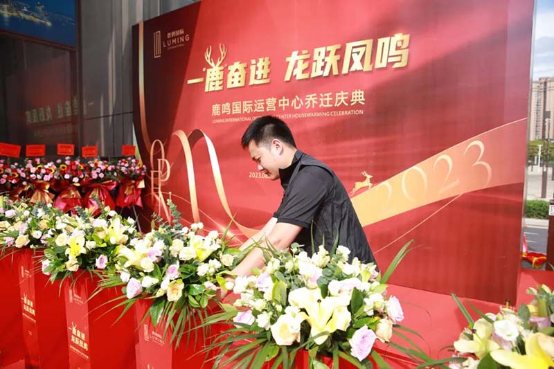 广东蓝度文化传播针对此次活动多次与主办方进行沟通对接,因应变动随时调整执行方案,为鹿鸣国际集团打造一场大气而喜庆的乔迁仪式。