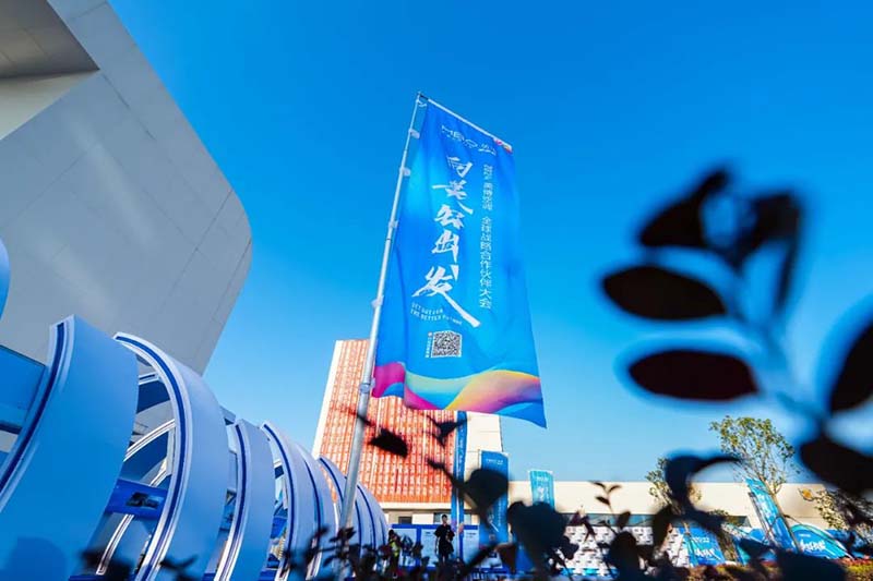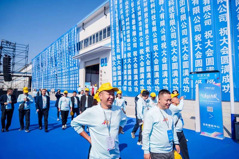 活动当天,基地外场、内场布置物料均以“向美好出发”主视觉进行延展和美博蓝品牌色搭配,以及前期机场、高铁、酒店接待欢迎的形式布置,都大规模地塑造落成投产仪式隆重、热烈的氛围。