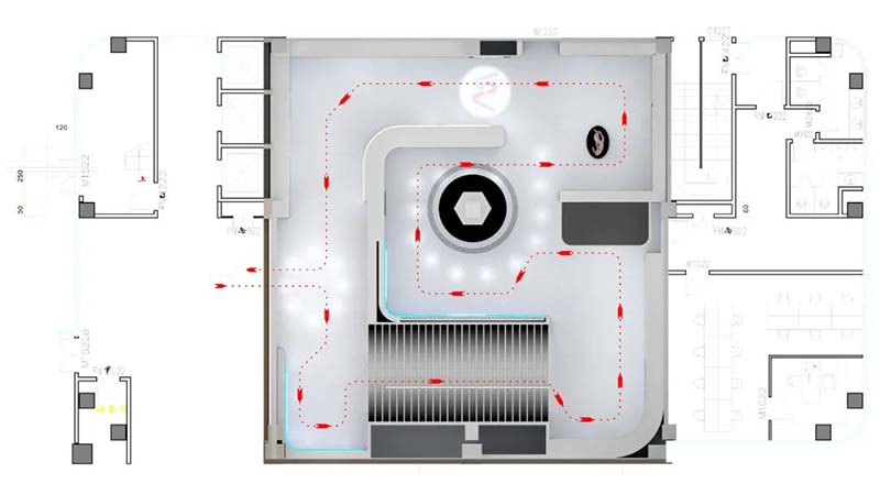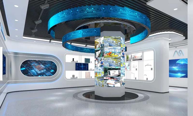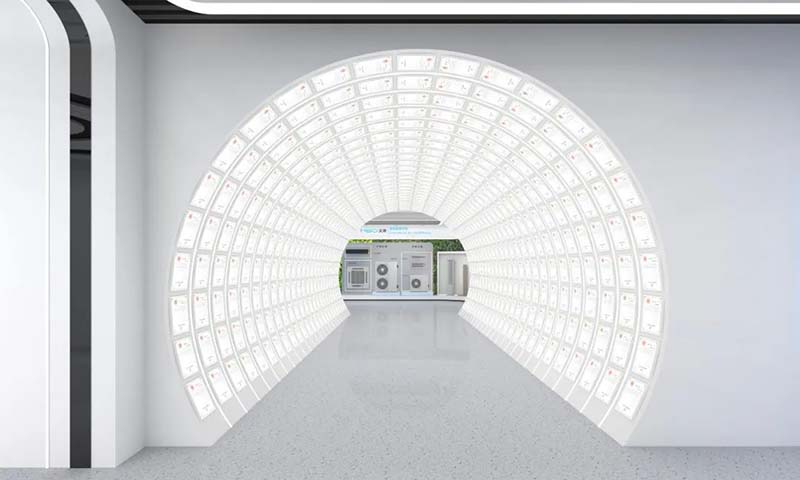 序厅作为整个产品体验中心的序曲,肩负着调动观众参观情绪的作用。我们以科技感和简洁风为主基调,圆顶吊顶融入美博集团 LOGO,颇有“天圆地方”之意。线条延展、流动、勾勒出简洁的设计语言 ,展现空间的生命力。