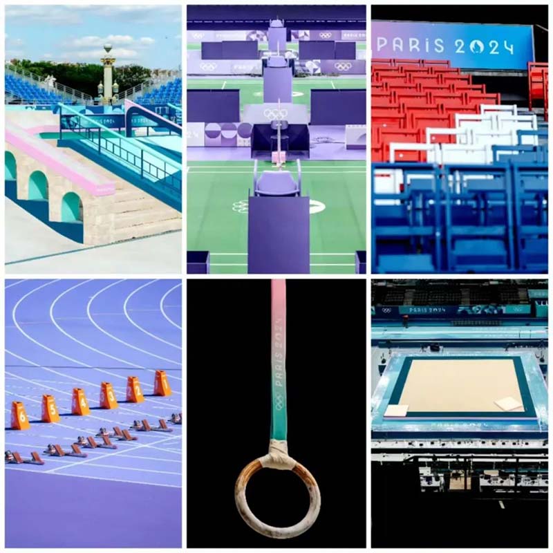 这次奥运会的颜色以紫色、绿色、蓝色和红色为主色,通过白色、金色、粉红色联系在一起,明亮和锐利的线条和简单的图形形状混合在一起,向装饰艺术风格致敬,以色彩庆祝奥运会的快乐,法国向全世界展示了巴黎