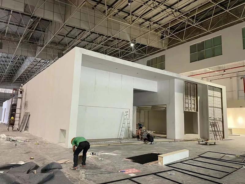 展台的施工搭建还在进行中,接下来蓝度美工团队进场,他们将负责展台的装饰和细节处理,包括挂画、布置光源、各类广告字、音响、wifi和硬件设备等,以确保展会的视觉效果达到最佳。