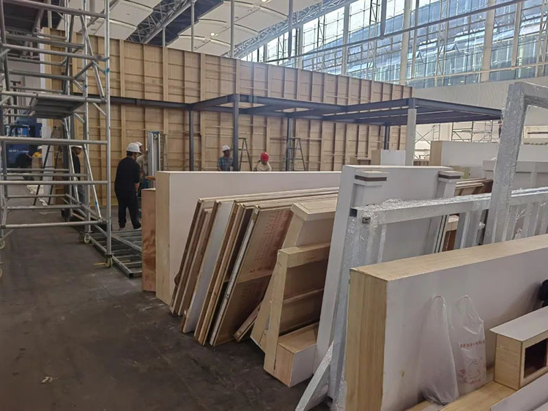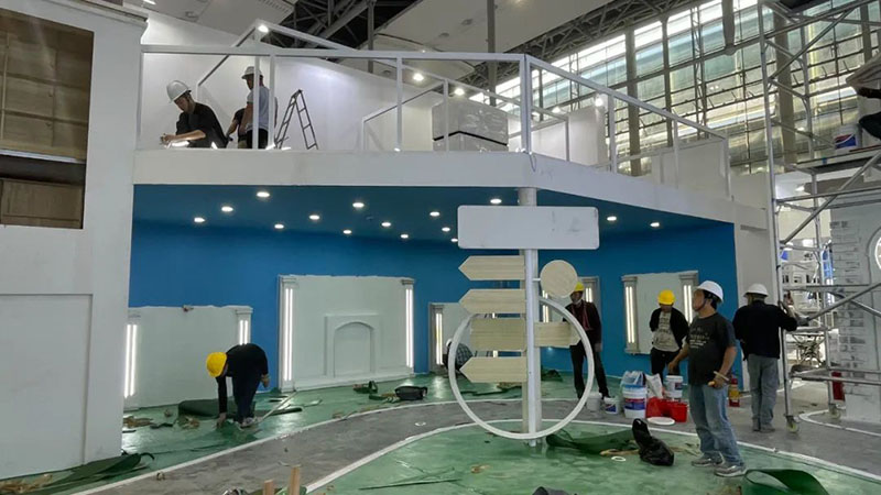 11月30日,距离2024中国国际涂料展开幕还有3天,蓝度团队正式进场搭建,开启罗斯夫主题展馆搭建工作。我们把定制板材和构建搬运到展位所在地开展组装搭建工作。
