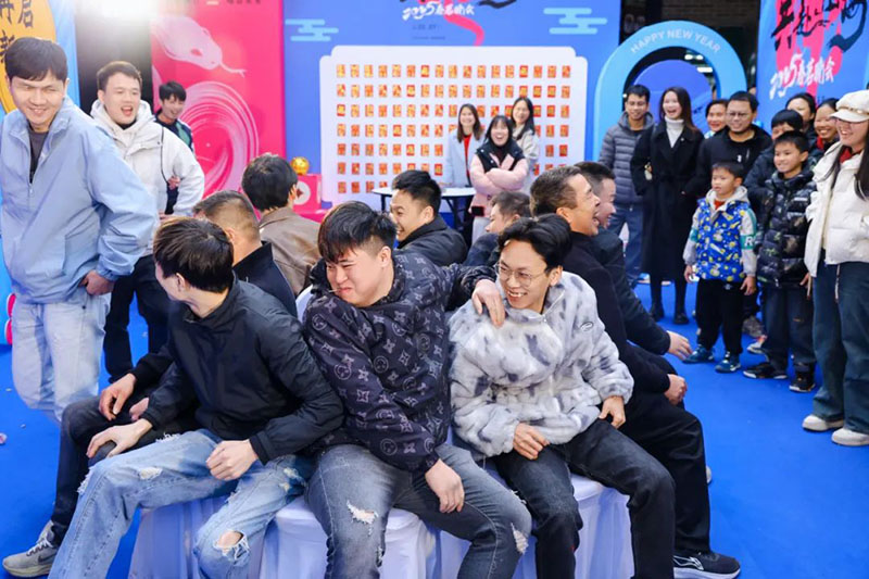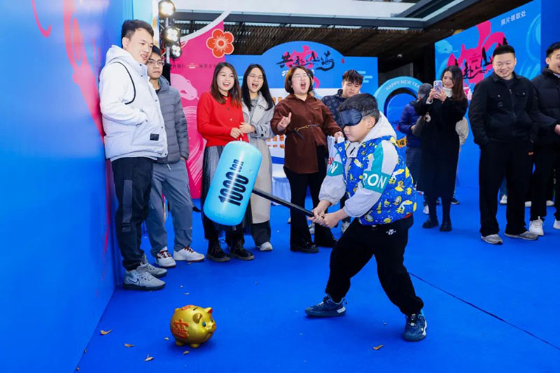 活动现场热闹非凡,各种趣味游戏轮番上阵:蛇来运转抢凳子、蒙眼铲钱游戏、红黄蓝反应大挑战、鸿运砸金猪等……蓝度成员及其家属玩得不亦乐乎,笑声此起彼伏。